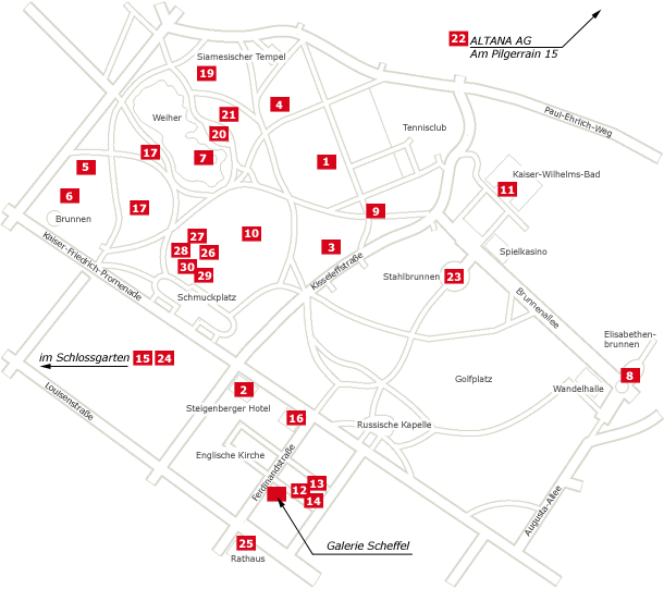Bitte klicken Sie im Lageplan auf die Zahlen oder weiter unten auf die Werktitel, um Abbildungen der einzelnen Kunstwerke und Angaben zu ihnen aufzurufen.