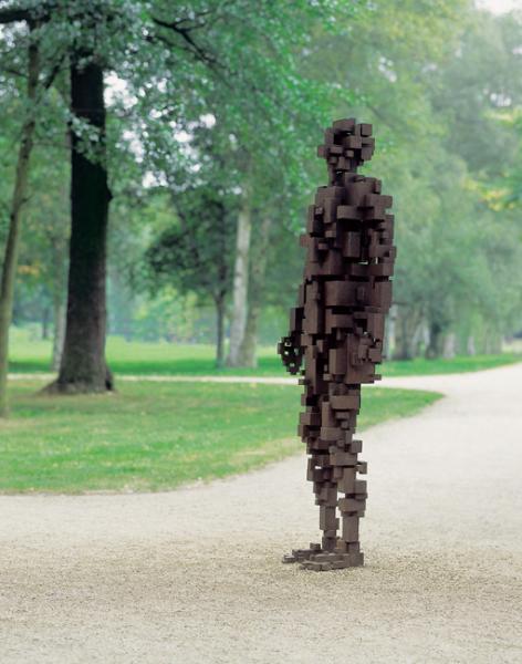 In der Ausstellung „Blickachsen 4“ wurde eine massive Eisenskulptur von Antony Gormley gezeigt: „Feel“. Sie stand auf der Kreuzung zweier Wege im Bad Homburger Kurpark. In der diesjährigen Ausstellung hat Antony Gormley eine scheinbar digitalisierte Version dieser Arbeit an exakt der gleichen Stelle positioniert. Die Masse der ursprünglichen Arbeit wurde übertragen in ein reliefartiges Regelwerk von Eisenklötzen, jeder jeweils acht Mal so groß wie der nächste – verschmolzen in einer algorithmischen Matrix, die den Raum und die Form in eine dynamische Spannung versetzt. Diese neue Arbeit lenkt die Aufmerksamkeit des Betrachters auf die Auflösung der Form. Es scheint, als habe der Raum begonnen die ursprüngliche Einheit des verlorenen Subjekts zu verschlingen. Dennoch bleibt der starke Eindruck eines ursprünglich gelebten Moments – so als sei die innere Haltung einer Person von ihrem eigentlichen Gerüst aus Knochen, Fleisch und Haut getrennt worden und als werde sie nun getragen von einem ihr wesensfremden System, das es ihr sonderbarerweise besser ermöglicht, sowohl die Unverwüstlichkeit von Erinnerung als auch die Unmittelbarkeit von Erfahrung zu übermitteln.