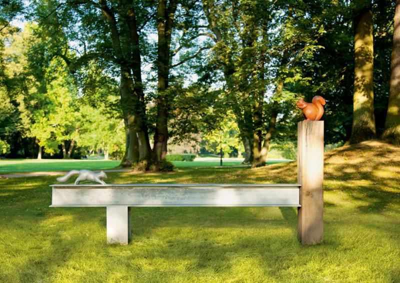 Bereits in der vergangenen „Blickachsen“-Ausstellung war Kenny Hunter mit zwei Arbeiten vertreten. „Red Boy“, seine auf die klassische Denkmalkunst bezogene und diese durch die vereinfachende Formensprache zugleich revidierende Darstellung eines kleinen Jungen von heute ist inzwischen dauerhaft in der „Skulpturenallee“ Bad Homburgs installiert. Die für „Blickachsen 7“ zur zweifachen Installation in einem archaisch wirkenden Waldstück des Kurparks geschaffene Arbeit „Bonfire“ (Lagerfeuer, Freudenfeuer) verweist auf Abenteuer und Wildnis, auf Ursprünglichkeit und Überlebensstrategien vergangener Zeiten, zugleich aber auch auf Umwelt- und Energiefragen der Gegenwart. Auch „Grey Versus Red“, die zweite in „Blickachsen 7“ ausgestellte Arbeit Kenny Hunters, thematisiert den Überlebenskampf: In Anspielung auf die Verdrängung des heimischen Eichhörnchens auf den britischen Inseln durch das aus Nordamerika eingebürgerte Grauhörnchen, wird hier durch die scheinbare Angriffshaltung des Grauhörnchens eine Konfliktsituation vor Augen geführt. Dabei unterstreicht die Gegenüberstellung der Farben, Materialien und Höhenanordnungen den metaphorischen Bezug auf gesellschaftliche Ordnung und soziale Strukturen.