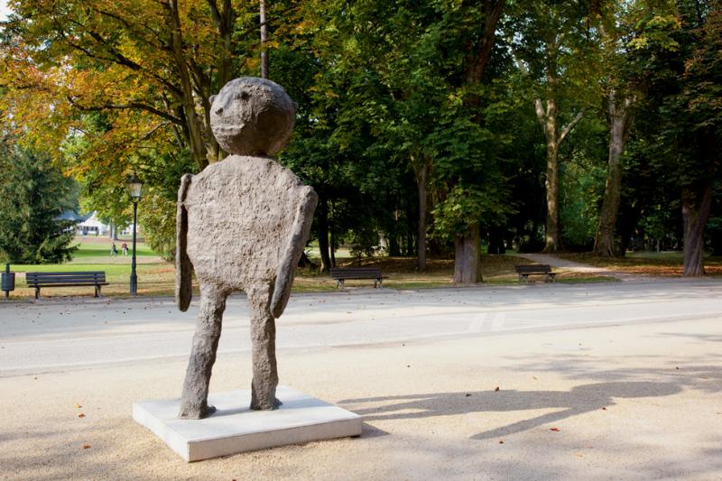 Donald Baechler ist mit zwei Skulpturen in den „Blickachsen 7“ vertreten. Wie Spaziergänger scheinen sich die bronzenen, fast kindlich-naiven Figuren unter das Kurpark-Publikum auf der Brunnenallee zu mischen. Auffallend sind ihre flachen Leiber und dünnen Gliedmaßen. Arme und Beine wirken wie bei Knetfiguren einfach an die Körper geklebt. Die kugeligen Köpfe, auf die auch die Titel der beiden ausgestellten Plastiken „Round Head“ und „Globe Head Figure“ verweisen, heben sich in ihrer fülligen Form davon ab. Baechlers Schaffen ist geprägt von heiteren, oft multimedialen Arbeiten, die eine Sprache der kulturellen Symbole sprechen. Der Amerikaner, der nach seiner Ausbildung in den USA auch an der Städelschule in Frankfurt a.M. studierte, wurde zunächst durch Bilder und Collagen bekannt. Darin arrangiert er bewusst schlicht wiedergegebene Alltagsmotive durch die Verbindung von Farbigkeit und Symbolik zu vielschichtigen modernen Stillleben. Seit den 1990er Jahren entstehen zahlreiche Skulpturen, deren Motive und Formen ebenfalls alltägliche Objekte oder einfache Figuren in scheinbar unbefangen-naiver Weise darstellen.