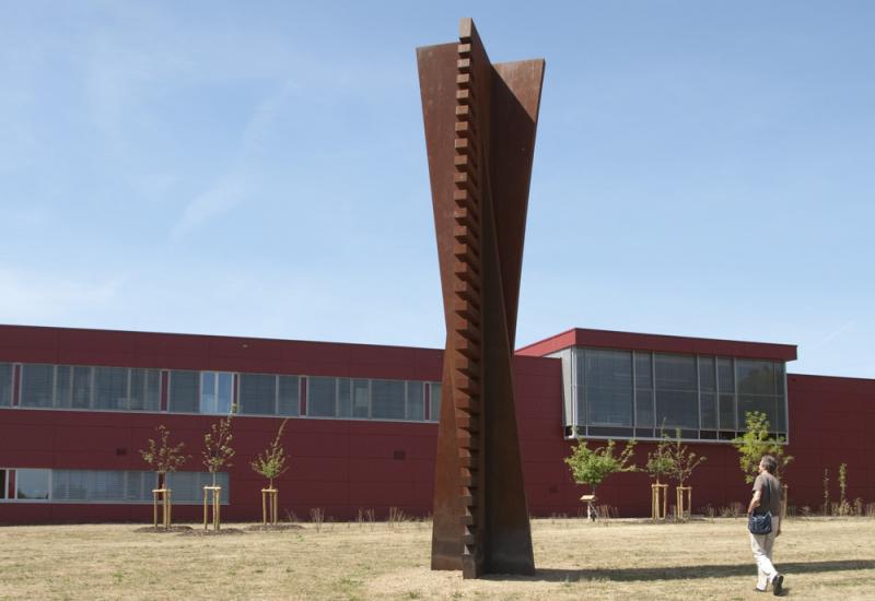 Nigel Hall gehört zu den bedeutendsten britischen Bildhauern der Gegenwart. Seine Arbeiten sind in Museen und privaten Sammlungen aller Kontinente vertreten. Neben freistehenden Außenraumskulpturen und den für ihn charakteristischen Wandreliefs, stellen zahlreiche Papierarbeiten einen eigenständigen Bereich innerhalb seines Werks dar und spiegeln sein Interesse am Spiel mit der visuellen Wahrnehmung. In seinen abstrakt geometrischen Skulpturen – meist aus Stahl, Bronze oder poliertem Holz – beschäftigt sich Hall mit den Eigenschaften räumlicher Konstruktion und der Raumwahrnehmung des Betrachters. Dabei spielen der innere Luftraum, die räumliche Umgebung der Skulptur und die Wirkung von Licht und Schatten eine ebenso große Rolle wie das Volumen des bearbeiteten Materials selbst. Je nach Lichteinfall und Blickwinkel des Betrachters verändert sich der Ausdruck der Arbeiten, die bildnerische Entsprechungen ihrer natürlichen Umgebung sind. “In meinem Werk ging es immer um den Ort“, erläutert Nigel Hall. „Es fasziniert mich, wie man geometrische Formen in der Landschaft ausmachen kann.“ Nigel Hall wurde vielfach ausgezeichnet und ist seit 2003 Mitglied der Royal Academy of Arts in London. Schon früh hat Hall seine Arbeiten weltweit ausgestellt und 1977 war er an der legendären documenta 6 beteiligt. Die jüngste umfassende Retrospektive seiner Arbeiten war 2008 im Yorkshire Sculpture Park eingerichtet. In Deutschland wurde Nigel Hall nicht zuletzt durch seine zweimalige Teilnahme an den Bad Homburger „Blickachsen“ in den Jahren 2001 und 2003 bekannt. Im Jahr darauf wurde sein Werk in einer groß angelegten Doppelausstellung der Kunsthalle Mannheim und der Galerie Scheffel gezeigt. In „Blickachsen 8“ ist Nigel Hall mit einer Bronze in Bad Homburg und zwei monumentalen Stahlskulpturen im Eschborner Camp-Phönix-Park vertreten. In den korrespondierenden Werken „Crossing (Horizontal)“ und „Crossing (Vertical)“ lotet Hall die Kombination verschiedener geometrischer Formelemente wie Bögen, Winkel und Geraden aus. Das plastische Zusammenspiel der Bogenformen mit den kammartig angeordneten Geraden hinterlässt in seiner horizontalen und vertikalen Ausrichtung jeweils unterschiedliche Wahrnehmungseindrücke. Beim Umrunden jedes dieser beiden ‚Übergänge‘ ergeben sich unterschiedliche Gleichgewichtsbeziehungen, verändern und verschieben sich die Verhältnisse zwischen Raum und Formen dramatisch.