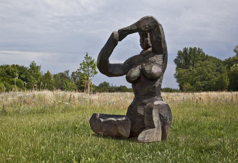 In diesem Jahr sind im Rahmen von „Blickachsen 8 RheinMain“ drei weitere kühn ausgestaltete Werke Dietrich Klinges im Skulpturenpark Niederhöchstadt zu sehen. Die beiden Arbeiten mit dem Titel „Entwurf für eine große Figur“ und die ebenfalls überlebensgroße Sitzende „Polyanthe“ entwickeln aus dem Spannungsverhältnis von massiver körperlicher Präsenz und raumgreifender Bewegtheit eine ganz eigene Dynamik: Sie wirken schwerfällig und zugleich dennoch beinahe tänzerisch und beziehen ihre Urgewalt aus dem Boden, auf dem sie stehen, und aus ihrer unmittelbaren Umgebung. Jede dieser Figuren sendet eine physische und psychische Energie aus, die selbst einen beiläufigen Spaziergänger unwillkürlich erfasst. Trotz aller Kühnheit der Formen und Gesten, geht es in Klinges Bildhauerei jedoch wesentlich um Kontemplation und innere Stille, oder auch um ein inneres Ringen zwischen aktiven und passiven Seinszuständen. Es ist die Balance zwischen der kraftvollen, eindringlichen Präsenz und einer geistvollen, oft spirituellen Haltung der Skulpturen, von der ihre unvergleichliche Macht ausgeht.