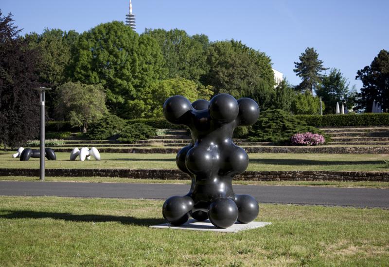 Die Werke des japanischen Künstlers Masayuki Koorida bestechen und verwundern durch ihre schlichte und zugleich ungewöhnliche Formgebung. Sie erinnern an Moleküle oder Amöben – an kleinste Teilchen oder Lebewesen, unendlich vergrößert. Aus schwarzem oder weißem Marmor oder aus Granit gemeißelt und anschließend auf Hochglanz poliert, erwecken die Gebilde mit ihren vollendeten Rundungen den Eindruck, als könnten sie bei Berührung zerfließen oder zerplatzen. Sie wirken fragil und doch stabil in sich ruhend, artifiziell und doch belebt. Im Rahmen von „Blickachsen 7“ lagen vier Arbeiten Kooridas verstreut auf einer weitläufigen Kurparkwiese und haben sich schnell als Publikumslieblinge herauskristallisiert. In diesem Jahr sind auf dem Campus Westend der Goethe-Universität sechs neue Arbeiten des Japaners installiert. Koorida beschreibt den bildhauerischen Schaffensprozess als Vorgang, in dessen Verlauf sich Gedanken und Eingebungen auf der Suche nach einer allgemeingültigen Sprache zu einer Vorstellung, einem konkreten Bild formen. Dieser „originäre Inhalt einer Skulptur“ erhalte in seinen Plastiken durch die reduzierte gestalterische Umsetzung ein vielschichtiges Erscheinungsbild, das wiederum die Fantasie des Betrachters anrege.