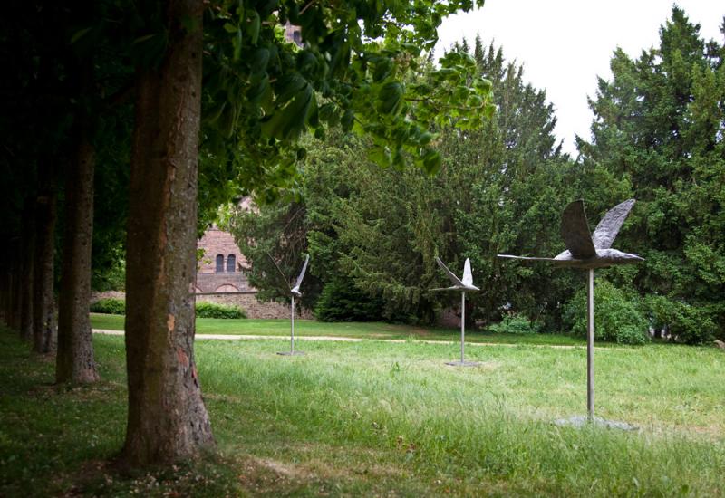 Die vielfach ausgezeichnete polnische Bildhauerin Magdalena Abakanowicz ist insbesondere für ihre großformatigen Figurengruppen im Außenraum bekannt. Ihr Oeuvre umfasst Figuren, tierähnliche Wesen und biomorphe Gebilde, die sie häufig in Gruppen anordnet. Neben ihren Arbeiten aus Sisal, Sackleinen, Gips und Holz sind seit Mitte der 1980er Jahre zahlreiche Skulpturen in Bronze, Eisen und auch Aluminium entstanden. Die monumentale Skulptur „Head“ erinnert in ihrer Anonymität an die monolithische Form eines Felsbrockens oder auch an einen Kopf – den Schädel eines riesigen prähistorischen Vogels. Ebenfalls in „Blickachsen 8“ ausgestellt sind drei gewaltige, auf Stangen verankerte Vögel, die sich hier zu einem Schwarm zusammengefunden zu haben scheinen, der in Richtung des Taunus fliegt. Die Gemeinsamkeiten und Unterschiede der merkwürdig geflügelten Vogelwesen erschließen sich beim Umkreisen der Gruppe. Zwischen Natur und Technik angelegt, erinnern sie etwa an einen Condor, an ein futuristisches Flugzeug oder einen im Raum schwebenden Kolibri. Jeder einzelne dieser Vögel (italienisch: uccello) durchmisst den Raum auf individuelle Art.