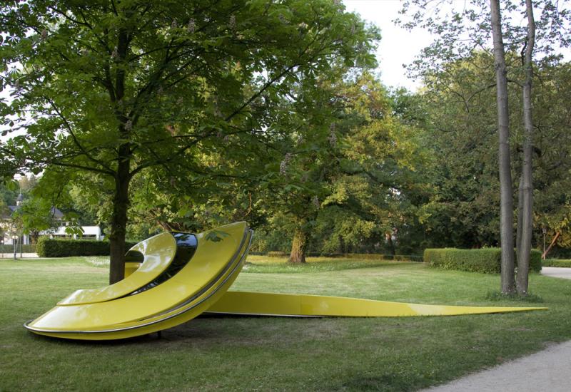Stefan Rohrers Skulpturen und Zeichnungen sind von seiner persönlichen Leidenschaft für das Auto geprägt. Er bricht die Karosserien von Autos, Motorrädern oder Rollern auf, streckt und dehnt sie durch das Einsetzen von Stahlblechen und verwandelt sie in elegant geschwungene oder arabeskenhaft sich schlängelnde Objekte. In ihnen scheinen sich wie mit dem Zeitraffer aufgenommene Bewegungsabläufe materialisiert zu haben, deren Geschichte sie erzählen. Nach eigener Aussage visualisiert Rohrer den Rausch der Geschwindigkeit – Katastrophen eingeschlossen. So schleudert das Vorderrad der aus einer Vespa gefertigten Arbeit „Arancio“ bereits durch die Luft, während das Hinterrad den Betrachter scheinbar zeitlich zurückversetzt in den Moment der Bodenhaftung. Der für „Blickachsen 8“ entworfene „Yellow Arrow“ wiederum windet sich unweit der durch den Kurpark führenden Straße um einen Baum, wobei der lang gezogene Schweif die rasante Geschwindigkeit und auch die Bewegungsrichtung markiert. Der Titel dieses grellfarbigen „Gelben Pfeils“ ruft mit dem Mythos „Silberpfeil“ die Geschichte der deutschen Rennfahrerei auf. Sehnsucht und Gefahr, Unbeschwertheit und Ernst führt Stefan Rohrer in seinen optisch verführerischen Arbeiten spannungsreich zusammen.
