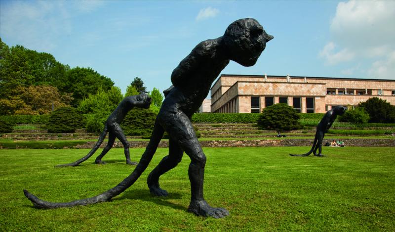 Für „Blickachsen 9 RheinMain“ hat Laura Ford eine Installation von sechs überlebensgroßen Katzenwesen mit dem Titel „Emissary Cats“ (Abgesandte Katzen) geschaffen, die auf dem Campus Westend der Goethe-Universität in gebeugter Haltung ruhelos grübelnd auf und ab zu schreiten scheinen. Nach Auskunft der Künstlerin wurden diese Katzenwesen inspiriert durch den riesigen, über die bittere Ernsthaftigkeit der Realität spottenden Kater Behemoth aus Michail Bulgakovs Roman „Der Meister und Margarita“. Und auch Masaccios „Vertreibung aus dem Paradies“ benennt sie als assoziative Vorlage für einzelne der Figuren. In den verschiedenen Posen der bronzenen Gestalten mit ihren schlanken menschlichen Körpern, großen gesenkten Katzenköpfen und langen, auf dem Boden aufliegenden Schwänzen erfasst Ford Zustände der Nachdenklichkeit, der inneren Rastlosigkeit, der Verzweiflung und des Gefangenseins. Auf dem Universitätsgelände eröffnet die Installation der in Gedanken versunkenen ‚Abgesandten‘ einen zusätzlichen Deutungsspielraum.