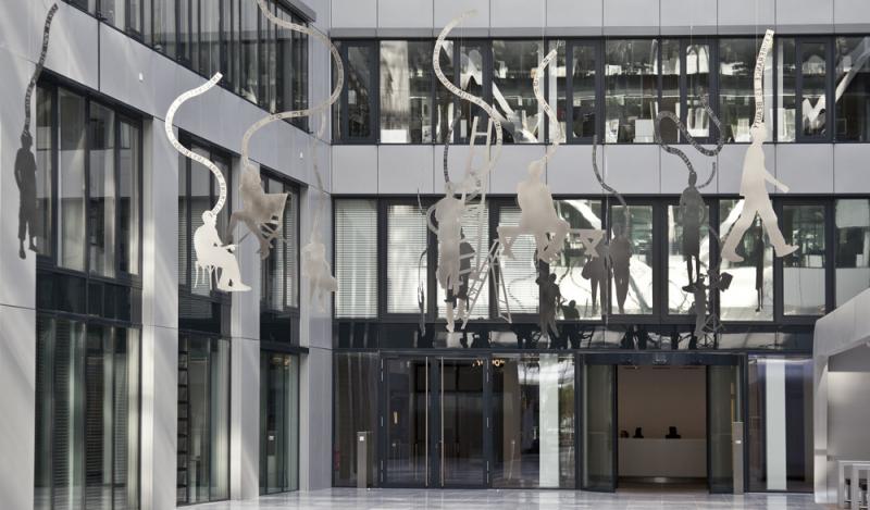 Jaume Plensa stellt am Frankfurter Flughafen im Gebäude The Squaire eine Installation von 16 „Silhouettes“ aus, die wie ein riesiges Mobile in einem der vier Atrien des Gebäudes über den Köpfen der Besucher schwebt. Die lebensgroßen Silhouetten von Menschen, die in den unterschiedlichsten Alltagssituationen eingefangen sind, hängen an metallenen Textbändern, die sich jeweils von ihrem Kopf aus nach oben zu schlängeln scheinen und in ihrer Funktion an die Spruchbänder mittelalterlicher Malerei oder an die Sprechblasen in Comics anschließen. Die aus dem Edelstahlblech ausgestanzten Buchstaben verbinden sich zu Zitaten aus der Literatur, insbesondere der Dichtkunst, die hier als Sinnsprüche die imaginative Beteiligung des Betrachters einfordern. Eine dieser Sentenzen ist William Blakes Satz „One thought fills immensity“ (Ein einziger Gedanke füllt Unermesslichkeit), der das Werk Plensas leitmotivisch durchzieht und auch das Konzept der „Silhouettes“ veranschaulicht: Für den Künstler haben die Stille und das Wort, haben Gedanken, Ideen und Träume ihre eigene Materialität und sind als vibrierende Energie bild¬hauerisches Material.