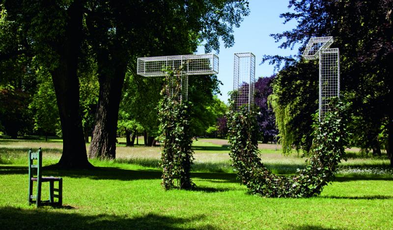 skulpturale Installationen als Orte der Begegnung, in denen Text als Hinweis auf vielschichtig