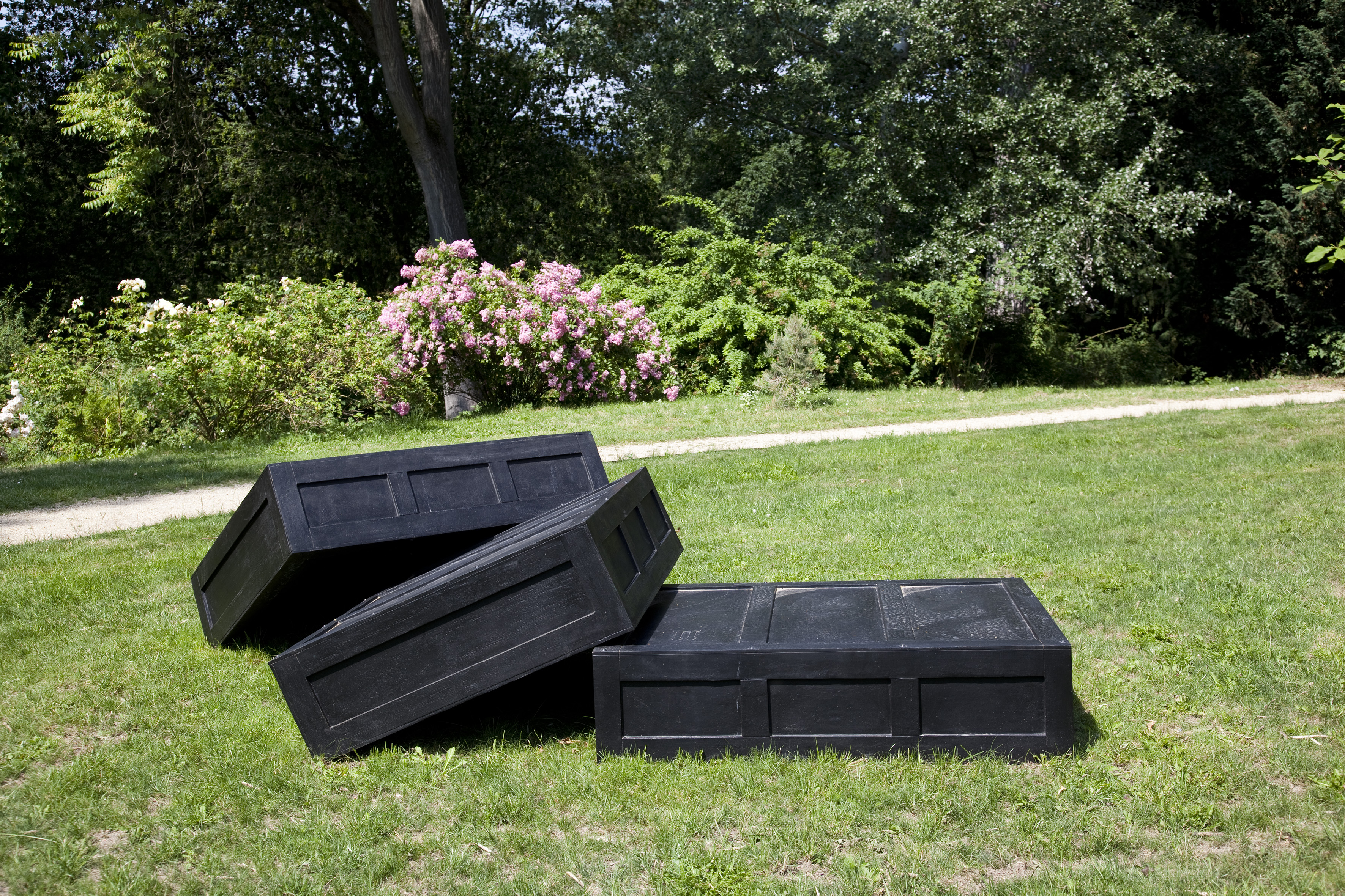Michael Elmgreen and Ingar Dragset have been an artist duo since 1995. Since then, the two Scandinavian artists, who live in Berlin, have not only shown their own works all over the world, but have also jointly curated exhibitions – for example, “The Collectors” in the Danish and Nordic Pavillions at the Venice Biennale in 2009, or the Istanbul Biennale of 2017. Elmgreen & Dragset often devote their attention to the institutional framework behind contemporary art – ie. to the art scene and the staging of exhibitions. Does a work only become art if it is shown in the right place and in the right way by the right institution? Does the museum in fact create art? In Blickachsen 12 also, the installation “Force Majeure, Fig. 2-4”, addresses a theme that is normally dealt with behind the scenes. The term “force majeur” means in effect an act of God, something beyond control; a formula that releases contracting parties from liability for an unalterable event. The three bronzes in this installation are modelled on crates for transporting artworks. Tipped over like dominoes, they lead the observer to wonder what could have happened: is this an unfortunate accident, or the metaphorical collapse of an entire system?