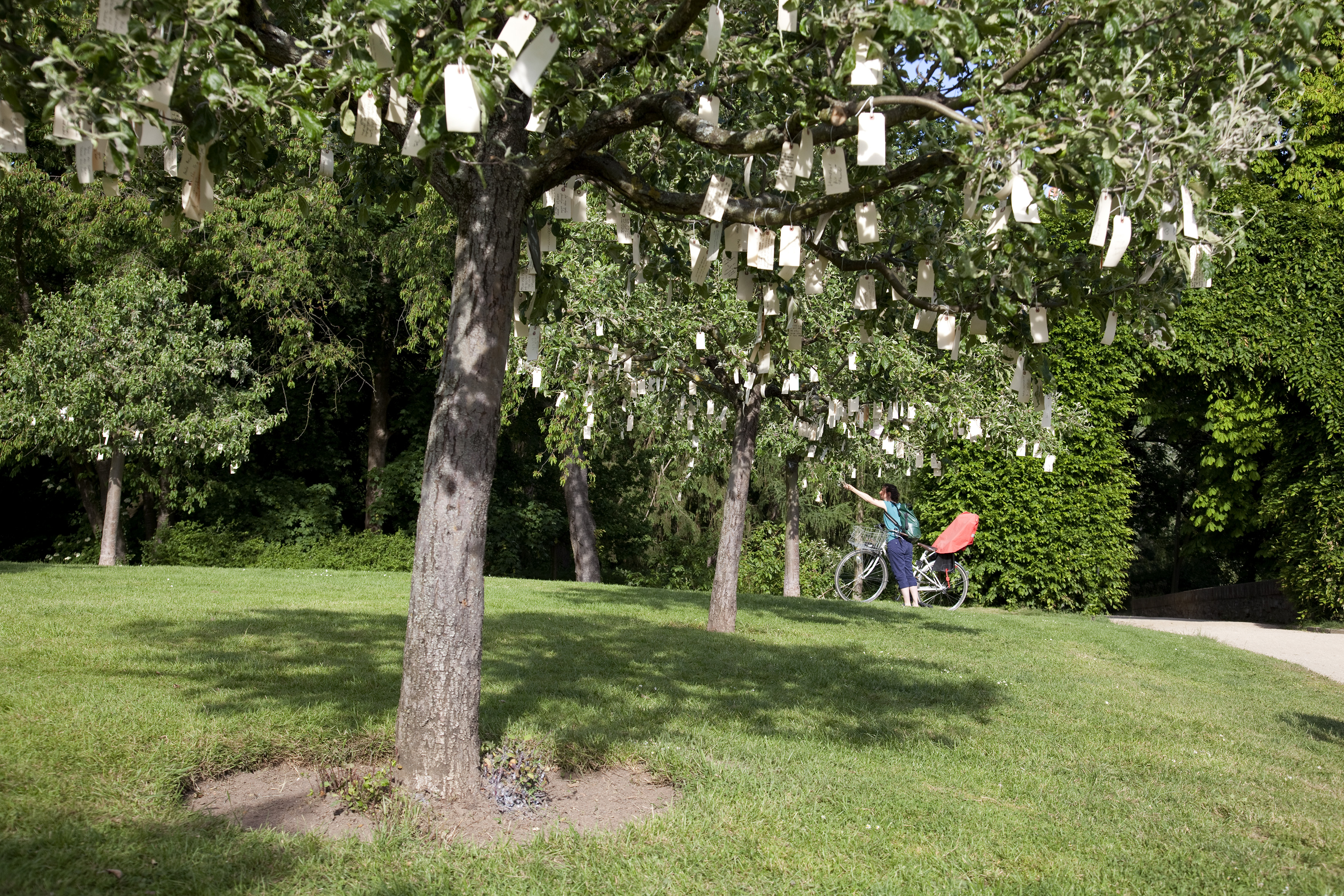 Yoko Ono created her first “instruction pieces” in 1955, and in so doing became a pioneer of concept and performance art. Since then, her artworks have frequently taken the form of ideas and words in place of objects: the work comes into being only in the mind of the observer – in the imagination, or through the carrying out of an often poetic instruction by the artist. Ono published a first collection of such “instructions” in 1964, in her volume “Grapefruit”. She caused a sensation in the art world by creating entire exhibitions consisting of instructions and demanding the active participation of the visitor. In Blickachsen 12, Yoko Ono now invites all visitors to the orchard of Bad Homburg Schlosspark to write down a wish and hang it onto one of the apple trees she has chosen as her “Wish Trees for Bad Homburg”. Gradually, the notes will come to cover the trees like white blossoms. Ono has set up her ongoing “Wish Trees” project in numerous locations around the world since 1996. The wishes are then collected together at her “Imagine Peace Tower” in Iceland. There, between 9 October and 8 December each year, the dates of John Lennon’s birth and death, a light pillar installation throws a beam of light up to 4,000 metres high into the sky.