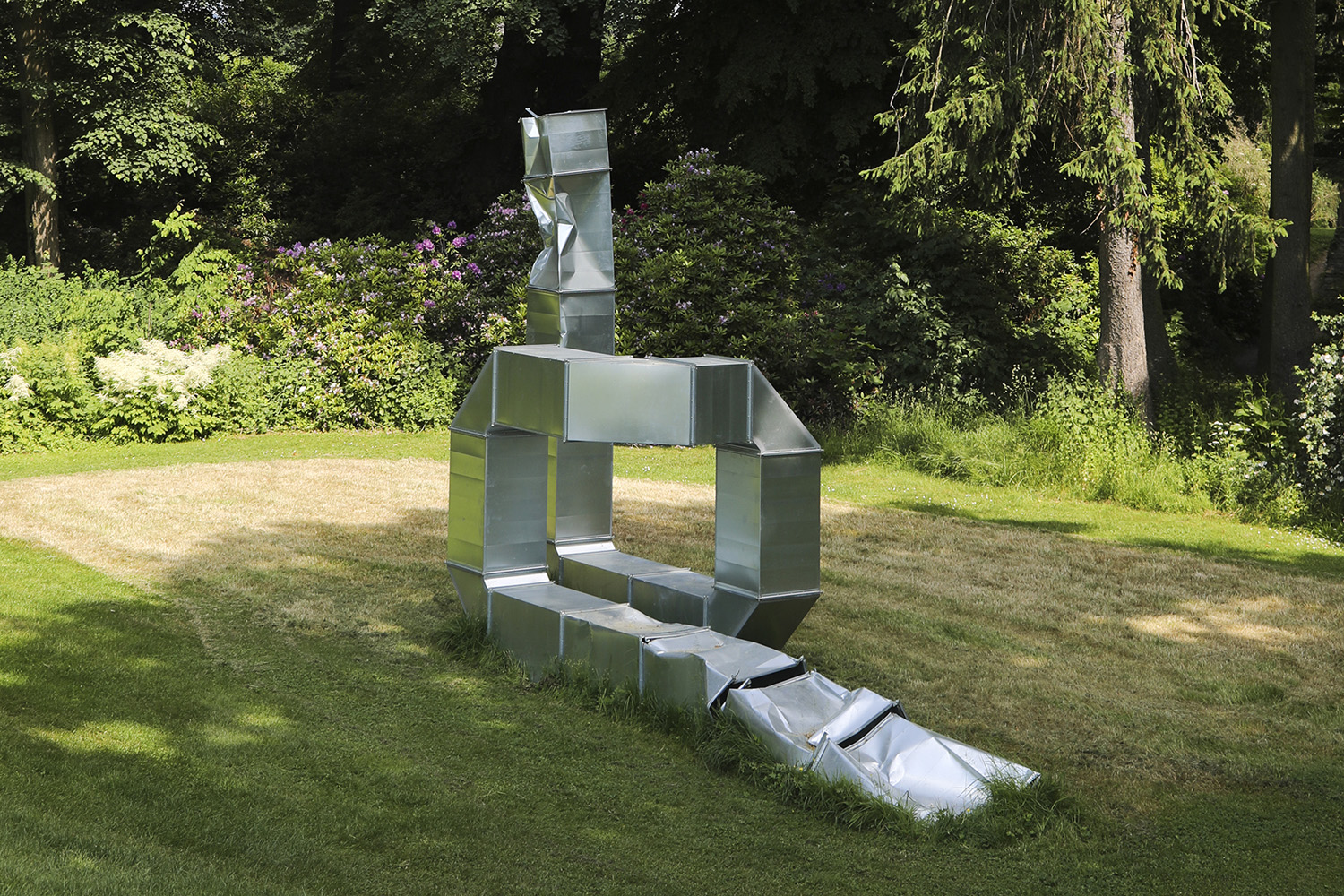 Playing with highly diverse everyday materials – whether building materials, consumer goods or foodstuffs – runs like a common thread through the works of the sculptor and installation artist Thomas Rentmeister. His sculpture “Square Tubes (Looping)”, on display in Blickachsen 13, is, like many of Rentmeister’s works, made of industrially produced material: the interconnected ventilation ducts made of zinc-plated sheet steel, seem, in the Schlosspark, to have landed in the wrong place. Where is the factory, where these items come from? Where is the building, in which they could be installed? Transferred into a new context, this sculpture suddenly seems to trigger another form of perception, steering attention towards the often hidden aesthetic of its everyday material. Depending on how the light hits its surface, the sheet metal appears either matt grey or coated in white reflections. The ventilation shaft goes into an absurd loop, ending at both ends in squashed, crushed deformations, in which the play of light increases once again.