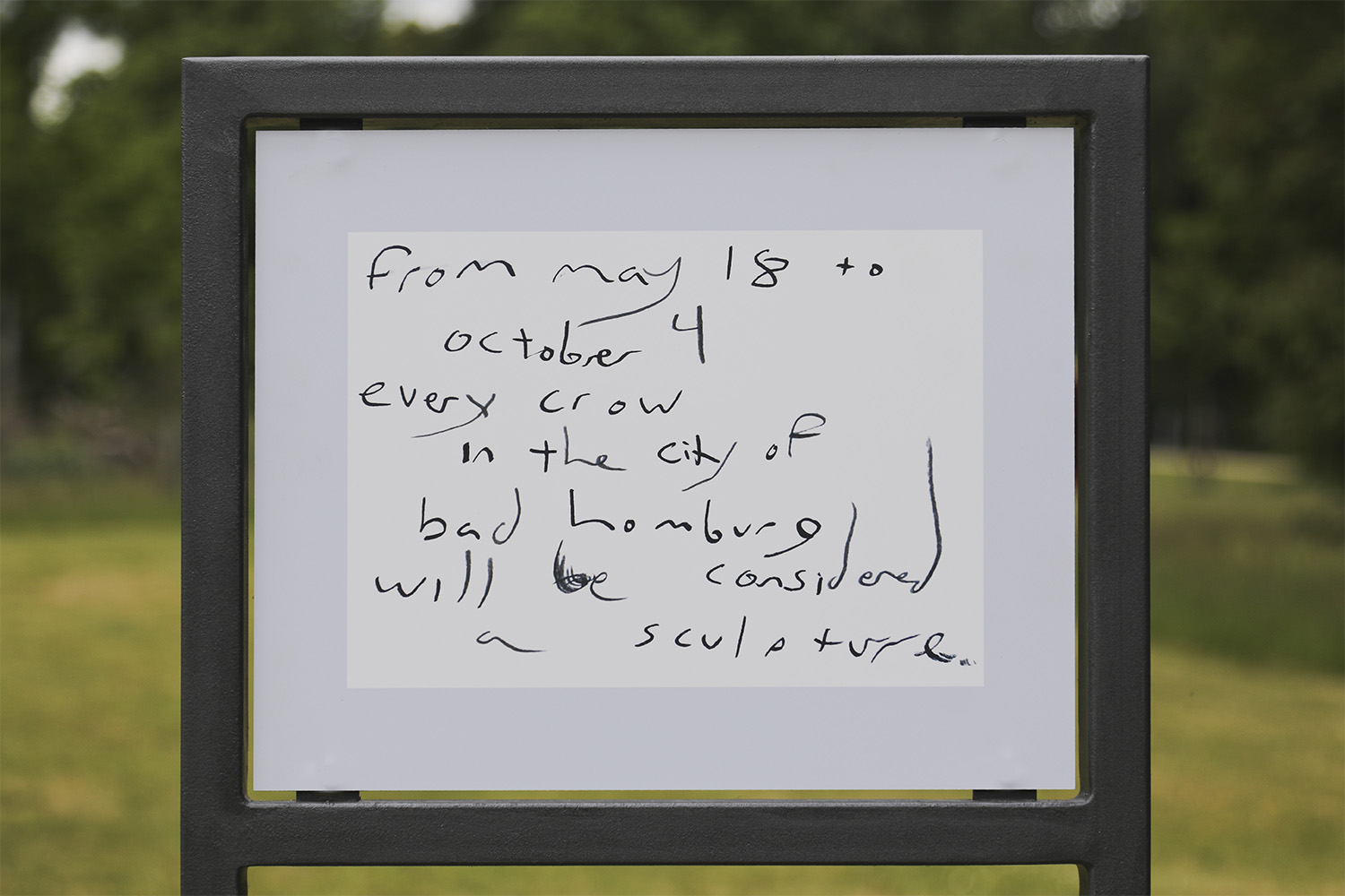 With philosophical astuteness, David Horvitz’s artistic work addresses networks, language and time systems. His oeuvre includes photography and artist‘s books as well as installations, mail art and Fluxus-inspired actions. Horvitz often incorporates local conditions into his works. To Blickachsen 14 also, he contributes a site-specific work: with “All the Crows of Bad Homburg”, the artist declares all the crows in town to be living sculptures for the duration of the exhibition. A handwritten note by the artist, which can be seen on a display board in the Kurpark, expresses this. Horvitz thus creates the framework for an unusual experience – viewing birds as art and seeing sculptures fly. In addition, the artist has produced T-shirts with the inscription “I Feed Crows”, which are handed out to a group of children. The shirts mark their wearers as custodians of the living artworks and at the same time promote the breaking of the rule in public parks not to feed unwelcome birds.