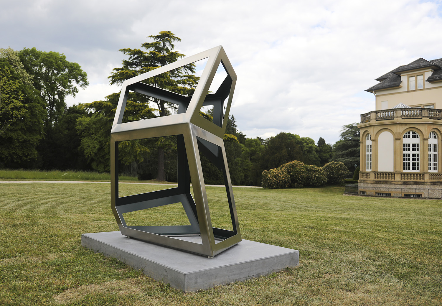 For fifty years, Richard Deacon has in different ways explored the characteristics of his materials in his sculptural work. The artist, who describes himself as a “fabricator”, creates sculptural constructs that invariably express the interplay of form and void and are thus open to the viewer’s play of associations. Two of the four works presented at Blickachsen 14 have titles that describe the artistic process: for “Cut & Fold #3” and “Cut & Fold #5”, Deacon cuts and folds stainless steel plates and joins them together to form geometric-prismatic shapes. The two elements of “Twofold Way CD (Black)” are also produced in a similar way. In contrast, the components of “Infinity #14”, each pierced by two or three holes, draw the eye especially to the diverse possibilities of surface treatment: the regular indentations glisteningly reflect the sunlight, which hits them directly due to their angled position.