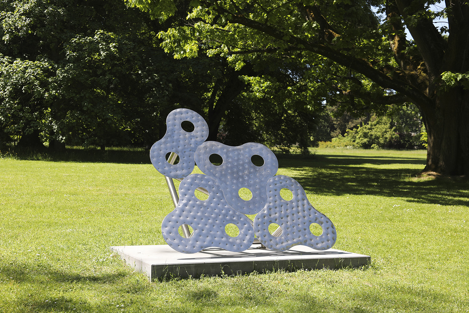 For fifty years, Richard Deacon has in different ways explored the characteristics of his materials in his sculptural work. The artist, who describes himself as a “fabricator”, creates sculptural constructs that invariably express the interplay of form and void and are thus open to the viewer’s play of associations. Two of the four works presented at Blickachsen 14 have titles that describe the artistic process: for “Cut & Fold #3” and “Cut & Fold #5”, Deacon cuts and folds stainless steel plates and joins them together to form geometric-prismatic shapes. The two elements of “Twofold Way CD (Black)” are also produced in a similar way. In contrast, the components of “Infinity #14”, each pierced by two or three holes, draw the eye especially to the diverse possibilities of surface treatment: the regular indentations glisteningly reflect the sunlight, which hits them directly due to their angled position.