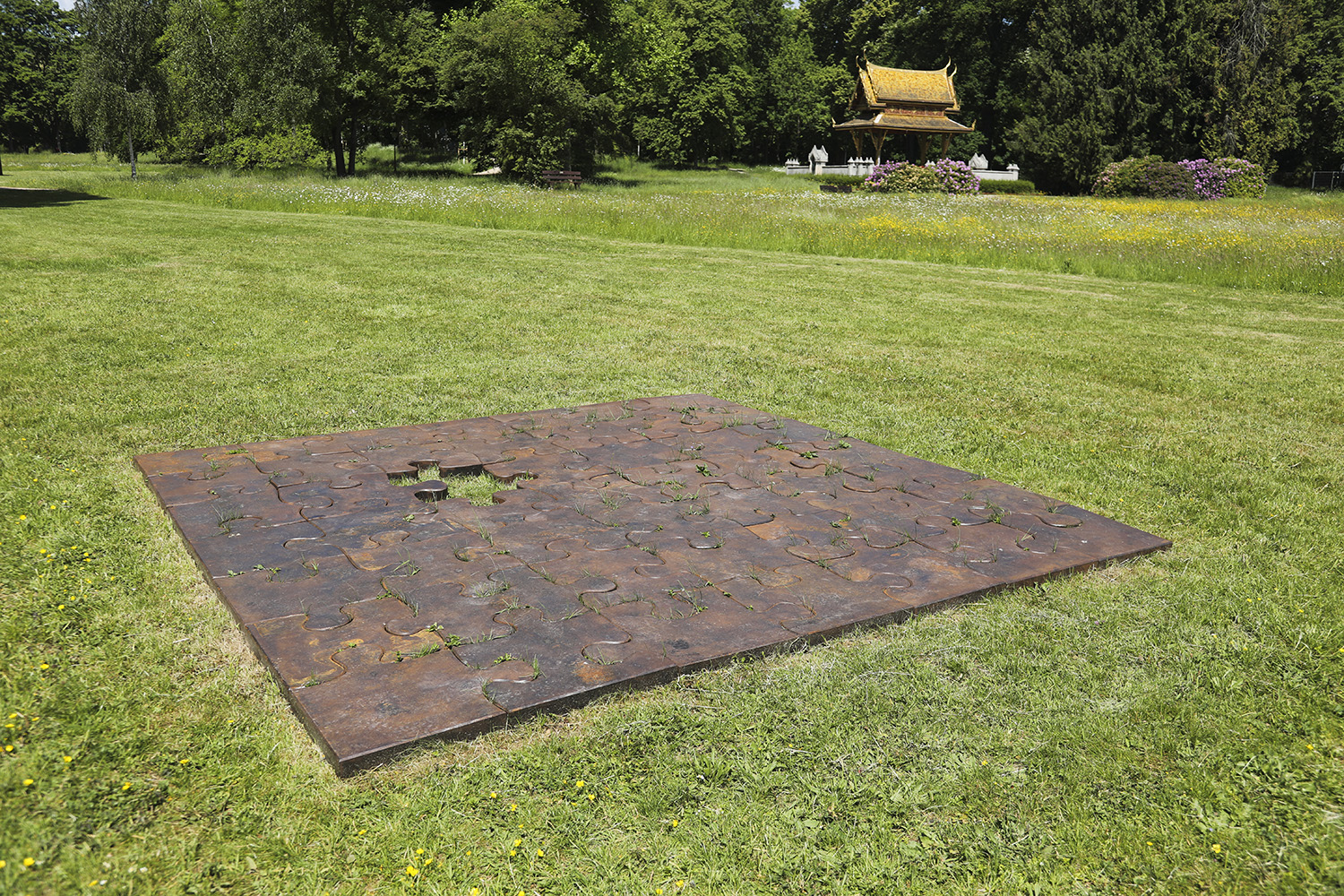 Georg-Friedrich Wolf‘s preferred material is steel. In large-format sculptures and work cycles, he tirelessly explores its properties and constantly expands the register of expressive possibilities that his material opens up for him. At Blickachsen 14, he is showing “The Missing Piece”, a key work in his oeuvre to date. A monumental puzzle square made of solid steel plates lies on a lawn in the Kurpark – but one piece of the puzzle is missing. For Wolf, the empty space in the arrangement system, the gap, is a “principle of life”, a space of possibility in which we can approach the world: “The search for the missing piece keeps our thinking in motion.” This idea is also taken up in the second exhibited work, “Fingerprint VI”. Blank spaces for puzzle pieces are inserted into the more than four-metre-high steles, which reveal new partial views of the surroundings as you walk around them.