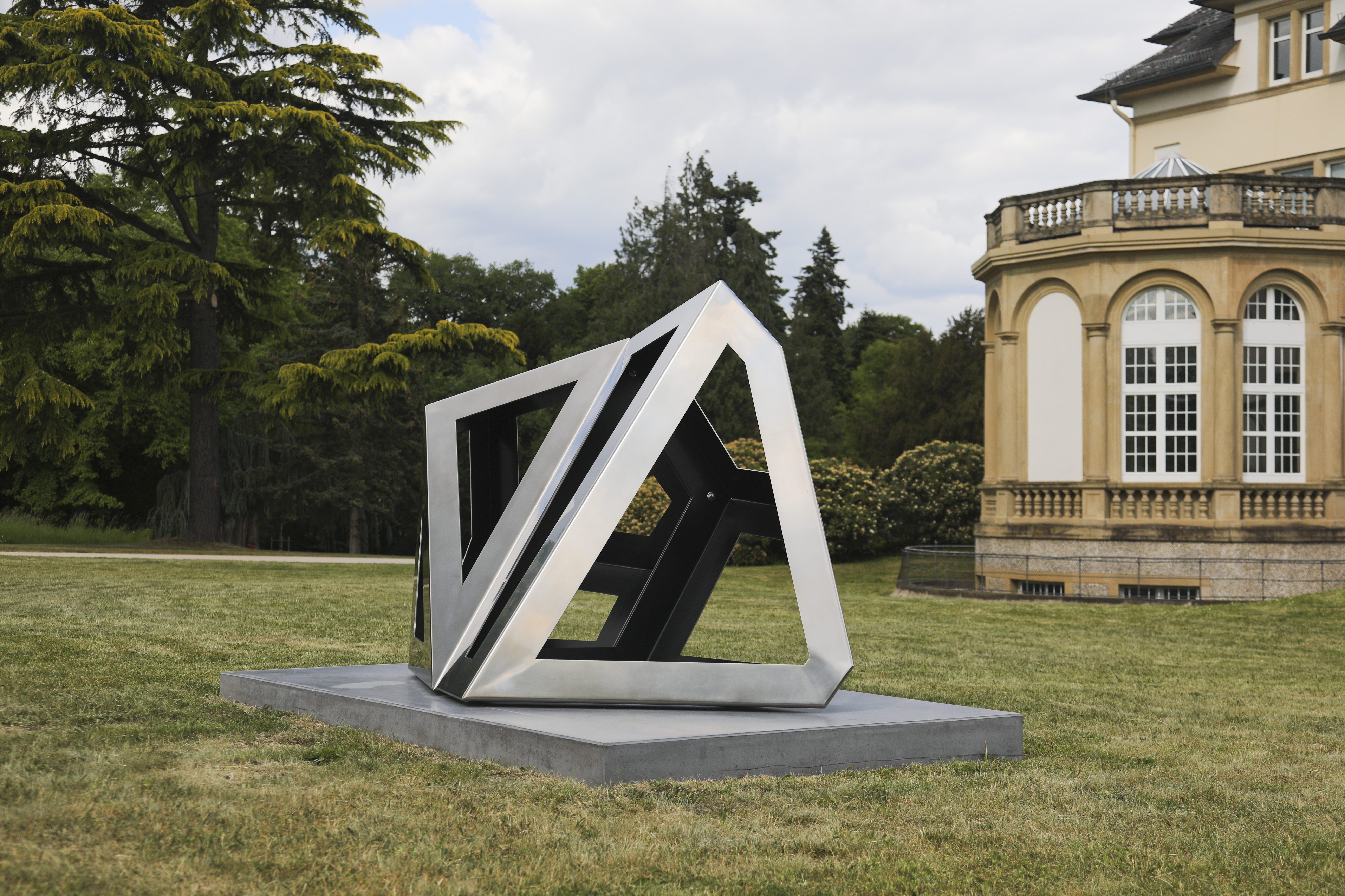 For fifty years, Richard Deacon has in different ways explored the characteristics of his materials in his sculptural work. The artist, who describes himself as a “fabricator”, creates sculptural constructs that invariably express the interplay of form and void and are thus open to the viewer’s play of associations. Two of the four works presented at Blickachsen 14 have titles that describe the artistic process: for “Cut & Fold #3” and “Cut & Fold #5”, Deacon cuts and folds stainless steel plates and joins them together to form geometric-prismatic shapes. The two elements of “Twofold Way CD (Black)” are also produced in a similar way. In contrast, the components of “Infinity #14”, each pierced by two or three holes, draw the eye especially to the diverse possibilities of surface treatment: the regular indentations glisteningly reflect the sunlight, which hits them directly due to their angled position.