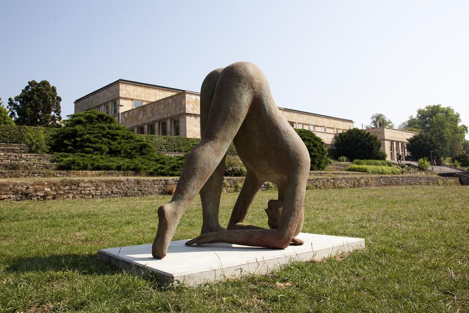 Henk Visch is a sculptor, draughtsman and poet as well as an exhibition curator and art critic. Figural works and abstract constructions belong equally within the Dutch artist’s oeuvre, which unites small objects and monumental sculptures in materials ranging from wood, via aluminium and steel, to bronze. At “Blickachsen 10”, four of Visch’s most recent bronzes, all dating from 2015, can be seen at the Westend Campus in Frankfurt. They show human figures standing, sitting, or in a gymnastic pose with head down and bottom up. Their bodies are twisted, their heads too large or too small in proportion to their body, and entire limbs are missing. Through their poses and gestures, the figures convey the impression of a search for inner and outer balance. But Henk Visch’s sculptures defy clear interpretation: they are to be understood as offering “limitless spaces for thought”. As viewers, we are invited to enter into figurative relation with the artworks and to approach them in a “childish”, i.e. open-minded manner. The enigmatic titles of the works thereby serve purely to spark associations.
