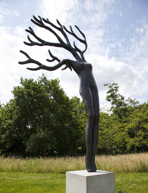 The work of Iris Le Rütte is determined by sculpture, drawing and poetry. Literature, and especially verse, is an important source of inspiration for the sculptural oeuvre of the Dutch artist, who is a pupil of Auke de Vries. At “Blickachsen 10” Le Rütte is showing three bronzes in the Niederhöchstadt Sculpture Park. In “Daphne in de wind” and “Daphne, vergeten herinnering” (Daphne, forgotten memory) she takes up a myth familiar from Ovid’s “Metamorphoses”: the beautiful nymph Daphne, fleeing from Apollo, prays desperately for a means of escape and instantly transforms into a laurel tree. In her interpretation of the motif, however, Le Rütte follows neither Ovid’s story nor conventional representations of the myth in art history. Instead, she underlines the sensual physicality of her Daphne figures, who stand on tip-toe as if dancing and seem to become one with nature with their arms spreading freely. The work “Iucundi acti labores” (Work that is all done is delightful) takes its title from a Cicero quote that corresponds to the Dutch proverb “na gedane arbeid is hed goed rusten” (It’s good to rest when the job is done). Le Rütte’s allegorical composition shows a cloth held up by two golden hands and draped into the shape of a bench, and it trusts to the serene power of the poetic image.