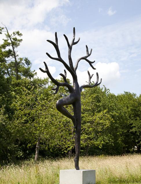 The work of Iris Le Rütte is determined by sculpture, drawing and poetry. Literature, and especially verse, is an important source of inspiration for the sculptural oeuvre of the Dutch artist, who is a pupil of Auke de Vries. At “Blickachsen 10” Le Rütte is showing three bronzes in the Niederhöchstadt Sculpture Park. In “Daphne in de wind” and “Daphne, vergeten herinnering” (Daphne, forgotten memory) she takes up a myth familiar from Ovid’s “Metamorphoses”: the beautiful nymph Daphne, fleeing from Apollo, prays desperately for a means of escape and instantly transforms into a laurel tree. In her interpretation of the motif, however, Le Rütte follows neither Ovid’s story nor conventional representations of the myth in art history. Instead, she underlines the sensual physicality of her Daphne figures, who stand on tip-toe as if dancing and seem to become one with nature with their arms spreading freely. The work “Iucundi acti labores” (Work that is all done is delightful) takes its title from a Cicero quote that corresponds to the Dutch proverb “na gedane arbeid is hed goed rusten” (It’s good to rest when the job is done). Le Rütte’s allegorical composition shows a cloth held up by two golden hands and draped into the shape of a bench, and it trusts to the serene power of the poetic image.