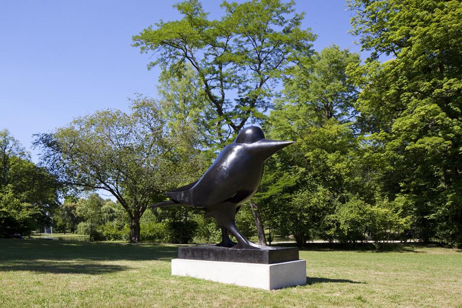 The crow is a recurring theme in the painted works of the Dutch artist Arie Van Selm – and it was the first of his motifs to be translated into a sculptural form. Working in bronze, and in a variety of sizes and colours, Van Selm produces two stylized variants of the crow – one of each can be seen in “Blickachsen 10”, in Bad Homburg and Darmstadt respectively. Jet black and over two metres high, “The Crow (striding)” reaches out in space, dominating its location in the Bad Homburg Kurpark. The clear lines and geometric form of the bird’s body are as characteristic of Van Selm’s bird sculptures as its smooth surface design, which gives no visible hint of plumage. The curved contour lines of this figure and the position of the wings re-inforce the impression of forward movement given by the bird’s stance. Van Selm is primarily interested in capturing artistically the crow’s striking form and bearing – yet his sculpture also references the historico-cultural significance of the black bird. To this day, the stories and myths which have grown up around the highly intelligent crow family all over the world still find their way into the fine arts, literature and film.