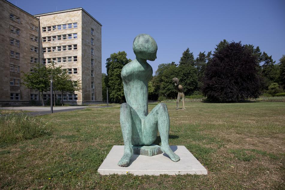 Henk Visch ist Bildhauer, Zeichner und Poet, er kuratiert Ausstellungen und schreibt Kunstkritiken. Figürliche Plastiken zählen ebenso wie abstrakte Konstruktionen zu seinem Œuvre, kleinformatige Werke stehen monumentalen Skulpturen gegenüber und das Material reicht von Holz über Aluminium und Eisen bis hin zu Bronze. Vier der jüngsten Bronzearbeiten des Niederländers aus dem Jahr 2015 sind im Rahmen der Ausstellung „Blickachsen 10“ auf dem Frankfurter Campus Westend zu sehen. Sie zeigen menschliche Figuren, die stehend, sitzend, oder in einer turnenden Haltung mit nach unten gebeugtem Kopf und hochgerecktem Gesäß wiedergegeben sind. Ihre Körper sind verdreht, ihre Köpfe im Verhältnis zum Körper zu groß oder zu klein geraten und einzelne Gliedmaßen fehlen ganz. Durch ihre Haltung und Gestik vermitteln die Figuren den Eindruck einer Suche nach innerer und äußerer Balance. Doch Henk Vischs Skulpturen entziehen sich einer eindeutigen Interpretation: Sie sind als „Angebote grenzenloser Denkräume“ zu verstehen. Der Betrachter ist dazu angehalten, sich selbst zu den Werken in Beziehung setzen, sich ihnen in einer »kindlichen«, im Sinne einer offenen Haltung zu nähern. Die rätselhaften Titel der Arbeiten dienen dabei lediglich als Assoziationsanregung.