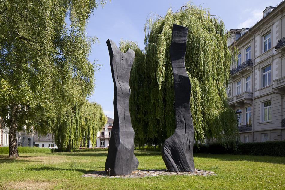 It would be hard to find another artist as committed to the natural material wood as David Nash in his multifaceted sculptural work. Even his bronze and cast iron sculptures are developed from working with wood. Nash is known around the world not least for his characteristic wood sculptures with partly or entirely charred surfaces. This year, in “Blickachsen 10”, three black patinated bronze works by the artist are on display, for which the wood models were also charred by a controlled flame, to give them a “new visual quality”. Even from close up, their surface structure and colour makes them seem as if they are made from charred wood – one has to touch them and knock on them to realize they are made of metal. Even with its title, “Black Butt” in the Bad Homburg Kurpark thematizes the roughly cut wooden ball that was its original raw material, while the smoothly worked “Three Humps” each display a gaping cut, making the artist’s creative intervention in nature patently clear. On the Ferdinandsplatz in Bad Homburg the majestic pair “King and Queen” consists of two towering abstract figures facing each other and forming a unit.