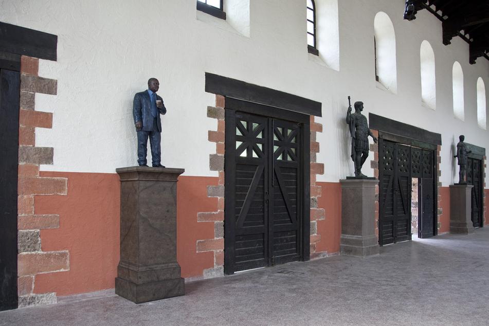 Journeying back into time at the Roman fort of Saalburg – the best researched and most completely restored fort at the UNESCO World Heritage site of the Limes – the visitor to “Blickachsen 10” will also encounter two painted bronze sculptures by Sean Henry. In the great hall of the principia, the headquarters building, stands Henry’s smaller than life-size “Man with Cup” on a specially-made plinth by the wall, fitting in inconspicuously and forming a row with the two Roman statues on permanent display here. In his blue business suit, holding a take-away coffee cup in his hand, he exemplifies today’s army of city office workers – and steers the visitor’s attention from provincial Roman history and life on the Limes towards the conditions of everyday life in the present. On the square in front of the principia, on the other hand, “Trajan’s Shadow” sparks a dialogue between past and present. Like a figure on a stage, a modern, casually dressed man with his hands in his pockets is framed by a great rectangular gateway – an exact scale replica of one of the many entrances to emperor Trajan’s market in ancient Rome.