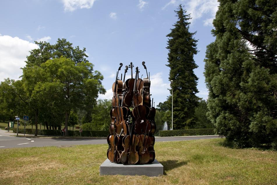 In addition to the two works presented in Bad Homburg, “Blickachsen 10” is showing a third sculpture by object artist Arman in Kronberg’s Victoriapark. In his famous “Accumulations”, “Colères” and “Coupes” series, Arman sought to integrate everyday reality into art, insofar as he elevated items of practical use – often musical instruments – into artistic materials which he piled up, arranged into a rhythmical order, sliced, splintered or scorched. The bronze “Music Power” on display in Kronberg is an almost 3-metre-high accumulation of twelve cellos, whose tops have been sliced down their fingerboard. Fascinated by the interior life of things, Arman dissected objects into which the viewer cannot normally see and then reassembled their fragments into new arrangements, thus lending the originals a new, artistic existence. Located in immediate proximity to the Kronberg Academy Festival concert venues, Arman’s bronze stands for the power of music for which it is named. Like the other sculptures exhibited in Kronberg, “Music Power” will be the inspiration for a musical composition to be premiered at a “Blickachsen” concert during the festival.