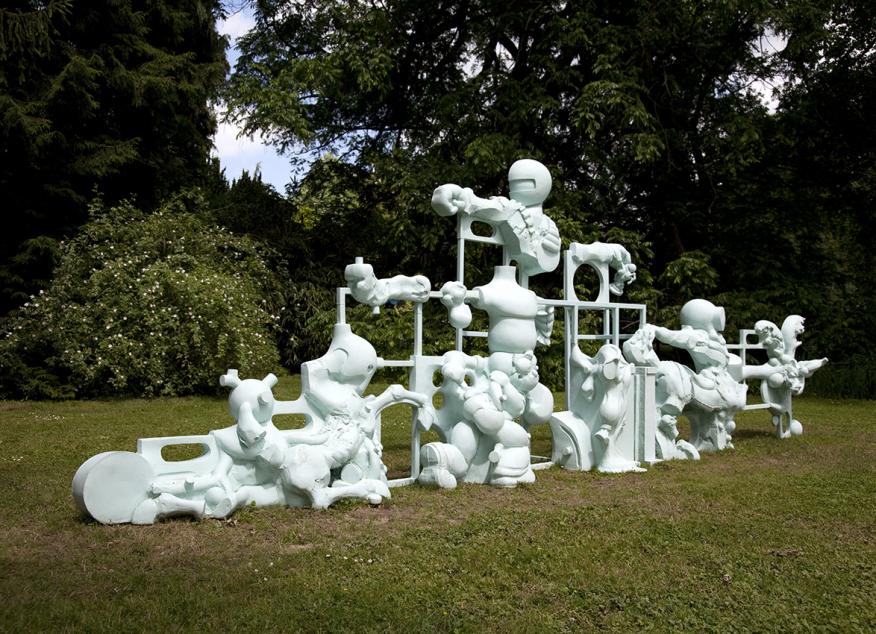 Nadia Naveau experiments with materials, colours and forms. She explores the boundaries between figuration and abstraction, baroque exuberance and reserve, classical and contemporary – and overcomes these boundaries in her work. She draws her inspiration from widely varying contexts and develops an idiosyncratic artistic language in which contradictions flow together. The artist creates her sculptures first of all in clay and later translates their forms into plaster, ceramic, plastic or concrete. “Roman Riots” represents Naveau’s interpretation of the Centauromachy, the mythical battle between the Lapiths and Centaurs – with Apollo at the centre. Naveau’s figures seem to belong to the world of comic strip, but she presents them in the manner of archaeological finds, on a metal support that seems to replace those elements that are missing. The triangular form of the overall composition and the pose of the central figure reference the representation of Apollo and the Centauromachy found on the west pediment of the Temple of Zeus in Olympia. The front of the work is correspondingly white, like marble, while the back is a luminous blue.