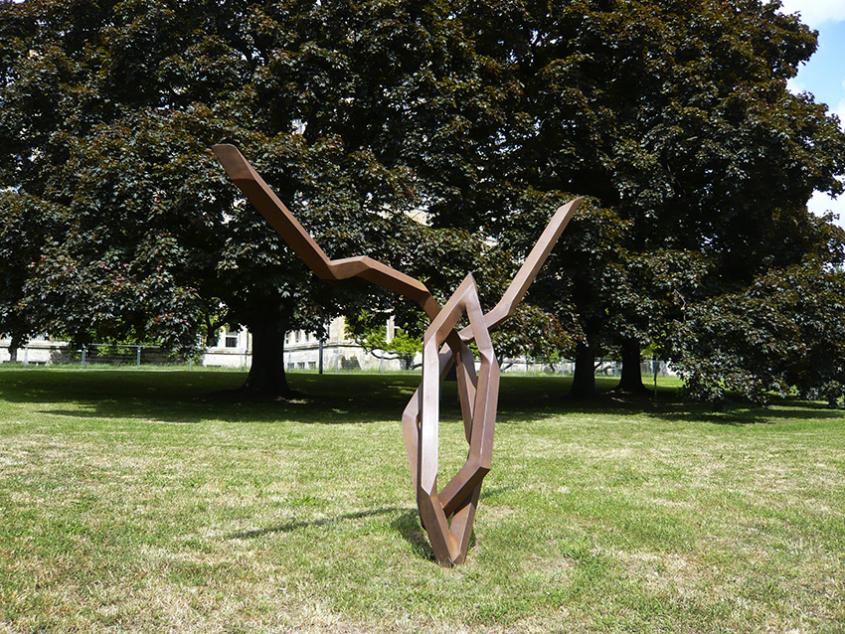 Robert Schad is known for his unmistakable steel sculptures in the public space. Starting from the idea of bodily movement, he creates linear compositions out of solid square steel which seem to conquer space in a dancing fashion. At “Blickachsen 10”, nine of his outdoor works are installed in front of the IG Farben Building at the Westend Campus of Frankfurt’s Goethe University. Properties such as heaviness, permanence and immobility are what we usually associate with the material of steel. Yet Schad’s three-dimensional drawings in space convey an impression of lightness and dynamism. Seemingly filigree despite their size, the steel lines reach skywards, seem to balance each other out in a horizontal equilibrium or wind sinuously up and down – sometimes in broad sweeps and curves, at other times compactly condensed. The agile appearance of these steel structures stands in marked contrast to the actual solidity of the material. “With steel, I particularly allude to the process of growth, the process of dance-like expression“, says the artist: “When viewed, the effect is one of motion caught in mid-movement.” At “Blickachsen 10” these sequences of movement captured in abstract form can be experienced in their full spatial expansion.