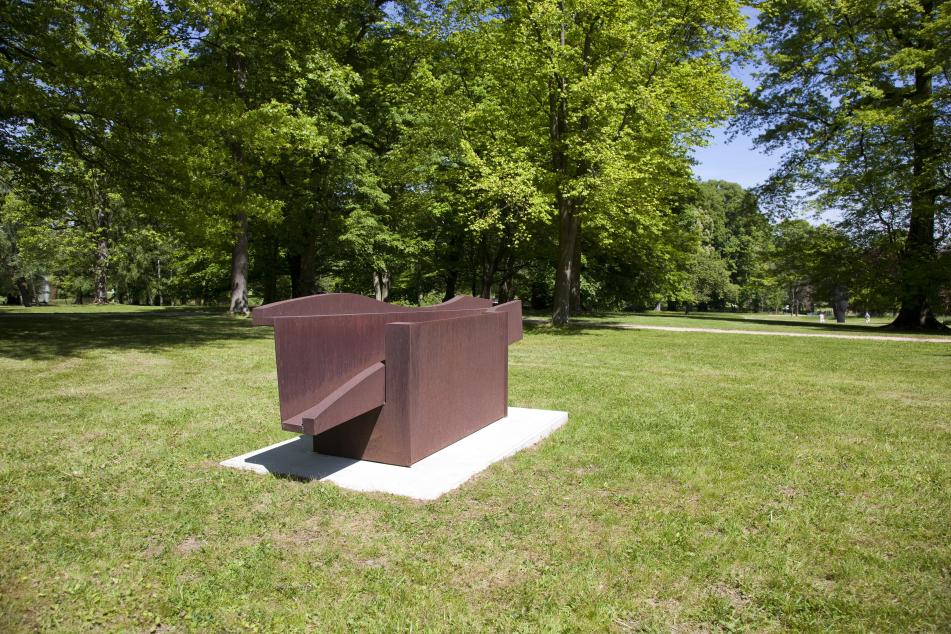 Geometrical structures characterize the sculptural work of the Austrian artist Gerhardt Moswitzer, who from 1963 worked exclusively in steel, aluminium and non-ferrous metal. Moswitzer’s artistic individuality, which he developed following an apprenticeship as a toolmaker and time at art college, had already established him in his early 20s as a regularly exhibited artist, and in 1970 he represented Austria at the Venice Biennale. In addition to his sculptural work, Moswitzer devoted himself from the 1980s to a range of other artistic forms: he composed experimental music, shot videos and films and worked on abstract photography as well as digital sculpture. His unmistakable large-format metal sculptures, however, remain typical of his œuvre. Moswitzer counters the geometrical surfaces and forms of his corten steel work, on display in the Bad Homburg Kurpark, by giving it the figurative title “Die schönen Beine der Kukita” (Kukita’s Lovely Legs). While on the one hand this motivates the viewer to discover human forms in the metal components, on the other it incorporates a narrative element into this massive, abstract sculpture, prompting the observer to reflection.
