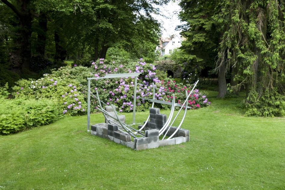 Michael Kienzer studied sculpture in Vienna under Bruno Gironcoli, who is also represented in “Blickachsen 11”. Kienzer’s works have been shown in international exhibitions since the 1980s and have received many awards. In his sculptural work he employs a variety of very different materials, such as metal, wood, foam rubber or glass, also combining these with painted elements. “Übertragung Vol. 2” (Transmission Vol. 2) is made of concrete and alumin- ium, and deals with the classical physical questions of sculpture: the relationship of load and support, the distribution of weight, expansion and stress, as well as spatial aspects of surface and line. In an open cube suggested by a frame of rods, hollow, industrially-made concrete blocks are placed together with curved aluminium pipes. While the concrete elements, stacked like a wall, delineate the borders of the sculptural space, the aluminium pipes extend beyond the set frame and are themselves at the limit of their material plasticity. This dynamic contrast is reflected, also, in the texture of the two materials: the smooth, cold, sleekness of the metal stands in opposition to the dead surface of the concrete.