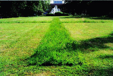 Ein 1 Meter breiter, ungemähter Rasenstreifen zieht sich gradlinig von der Leuchtfontäne an der Kaiser-Friedrich-Promenade herab in Richtung Weiher-Fontäne. In etwa der Mitte dieser Linie wird er von einer gleichen ungemähten Rasenlinie rechtwinklig durchschnitten. („Ohne Titel", 1999, Plan Nr. 10)