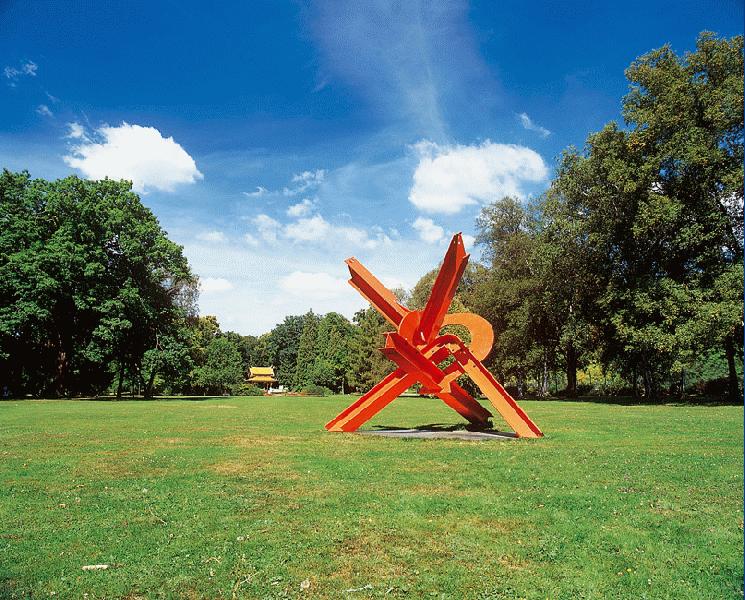 In dieser Gesamtwirkung trifft sich die Arbeit Sebastians mit der seines international renommierteren US-amerikanischen Kollegen Mark di Suvero. Im Gegensatz zum Mexikaner sind die Arbeiten di Suveros jedoch keine Durchdringungen komplexer stereometrischer Formen, sondern freie Kompositionen aus unterschiedlichen Stahlele-menten herkömmlicher Standardprofile der Bauwelt: Doppel-T-Träger, Stahlbleche, Metallscheiben u.s.w. Diese Teile fügt der Künstler zu eigenwilligen Großkonstruktionen zusammen - unfunktionalen Ingenieurbauten - , die den Raum umfassen, integrieren und in ihn hineinwachsen. Die Stahlelemente werden zu einer gegenstandsfreien, abstrakten Komposition gebündelt, bilden formale Verdichtungen, Knotenpunkte ebenso aus wie lineare Raumdurchdringungen, die mitunter filigran oder gar labil wirken. „Pour le Pont Inconnu" von 1996 (Plan Nr. 16) wirkt von Ferne in der grünen Landschaft wie ein fremdartiges, rotes unbekanntes Wesen, aus der Nähe wie ein konstruierter Knoten, dessen auslaufende Träger gradlinig in viele Richtungen auslaufen: Bewegung, Dynamik und Energie strömt von dem in sich ruhenden inneren Knoten aus. Die Plastik wirkt kraftvoll in den Raum hinein und erfüllt ihn. Sie steht mit ihren funktionsorientierten Stahlelementen und der strahlend roten Farbigkeit gegen die Natur, integriert sich aber gleichzeitig in sie durch ihre Kraftströme: Das wirkliche Denkmal eines unbekannten Dichters!
