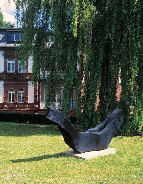 The sculptural and architectural symbols of this expression then and today are the elementary shapes of pyramid and obelisk, globe (as image of the cosmos) and cube. These are also the shapes Nash found for himself, apart from the landscape garden. Already in 1985 and the following years, "Nature to Nature" was the leitmotif for his three elementary shapes that he also uses in Bad Homburg. The untouched nature he experienced in the Australian desert will find its way back into nature when it subordinates itself under the laws of growth and decay. Originally, the material of his three nature sculptures was charred wood that had received a second black "skin" from the fire. The cellular structure of the burned surface that is not seen in the bronze cast was the result of the dialogue between the