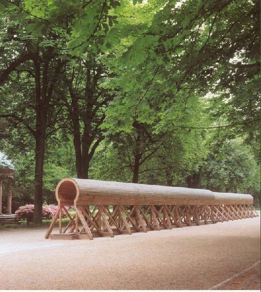 In passing through the corridor the head of the traveler reaches the circular, vaulted upper part of the tunnel. His eye is basically directed along the course of the corridor. Not the focusing of an object but the aiming of the sight is intended – we are brought closer to a clipping of the topography by walking through the "telescope". Furthermore, the artist enhances the aesthetic perception and sensual experience of the space by an irritation of orientation: by their diagonal position on the park alley, each element of the sculpture claims its spatial and formal independence from the axial structure of the rest of the gardens. The arcades are not strictly parallel to each other, but slightly shifted. "One is reminded," explains Kolberg, "of the contra-rotating strokes of the two sides of an ancient galley (or to the movement of a centipede), where the construction of structured ribs and dynamically horizontal plank boards suggests that of a boathouse.