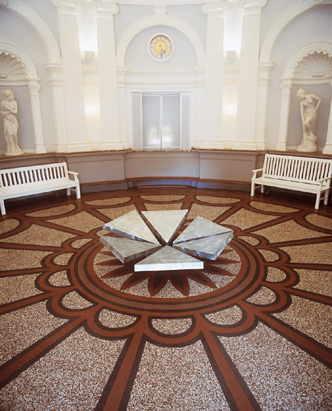 "Six Triangles, Hexagon V" that has a kind of precursor in the series around the "nimble squares" of 1969, is based on a rhythmically staggering pattern of triangular surfaces each of which is inclined toward the middle, their short poles being attached to their undersurface and welded to a hexagonal frame. The triangles are arranged in a radial pattern not touching their respective neighbour. In the (hexagonal) inner or outer outline of their semicircular diameter they do not fuse into a ring either or even reach the same height. This way, the free standing of each basic shape and the weight of each triangle remain visible. At the same time, the symmetry of three triangles on each side facing each other in complete balance gives an impression of tranquility, corresponding to the inhaling and exhaling of an organic body. Even when stationary, the triangles' funnel-like inclination towards the middle hints at a soft rhythm of movement, as if they would open and close in harmony like the petals of a flower. Besides the association "flower", the work may also be seen as kind of a bowl or vessel. Here an ever vanishing content has to be refilled again and again with scooping gestures. The principle of life is congruent with the desire for fertility.