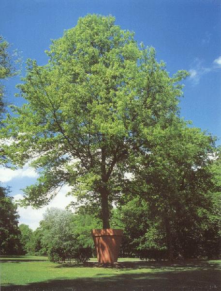 The actual garden sculpture "Baum im Topf" ("Tree in Pot") was realized in detailed sketches by Ulrichs for the first time for the French Gardens in Celle in 1994, designed as an unmovable outdoor sculpture. For the Kurpark in Bad Homburg he therefore created a new but nearly identical version. In his application for the competition of the landscape patio of the Bundessortenamt (federal bureau of botanical varieties) in Hanover where he proposed the concept of his outdoor sculpture he gives a detailed explanation: "My project of tree as potted plant requires a tree to be planted (in this case a linden tree for its shallow roots) and provide it with a large, 250 cm high flower pot (without soil) so that for the dummy the tree will not seem rooted at all, but movable, like a set piece, a mobile piece of furniture. One may say that the tree, similarly centralized like a village's linden tree in former times, represents nature, meanwhile the pot stands for culture. The same type of haunting domestication forms part of the work of the Bundessortenamt: testing and cultivating plants in respect to their usability for man, growing and bringing up varieties and nursing the trees. Therefore the tree stands for the tense relationship between nature and culture without crudely pointing it out. The effect is rather playful, a transplantation from Gulliver’s world (or Claes Oldenburg's) into ours. The tree whose growth will not be disturbed by the pot is naturally easy to care for and weatherproof. The concrete pot ... will once in a while need a new painting with brick-red emulsion paint that I will provide. Upside (not to be seen) the pot is protected against falling leaves by a metal grid."