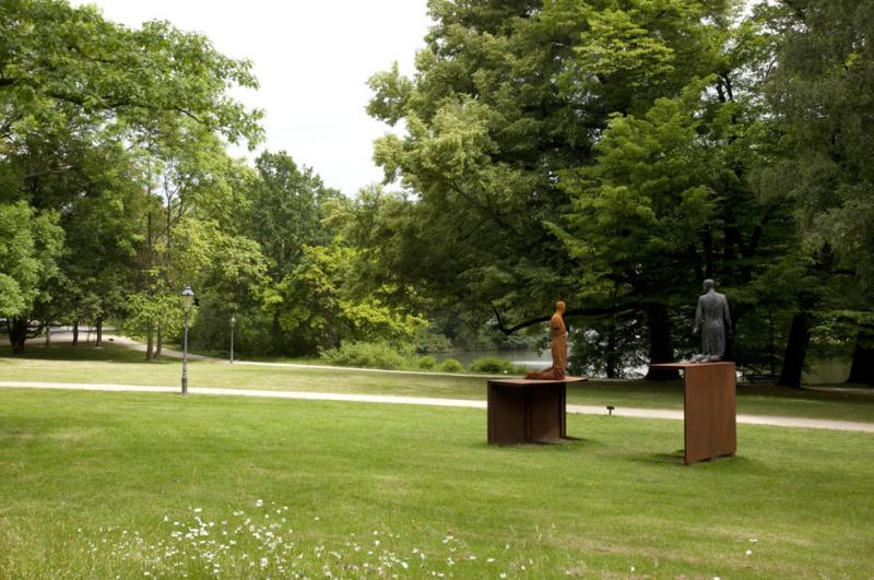 Man stands at the centre of Hanneke Beaumont’s artistic creations. Her lifesize figures in terracotta, bronze or iron are supra-individual characters, covered as in a second skin with simple garments. Neither their sex nor age is discernible. Beaumont does not create a portrait, she visualizes through her sculpture the spiritual condition of Man. In “Blickachsen 7” she presents an installation consisting of two figures, each kneeling on their own minimalistic steel base. In this composition, entitled “Melancholia I” – recalling Albrecht Dürer’s engraving of the same name – Beaumont, as she remarks herself, is thematizing the creative process of sculpture. The finished black bronze figure – Melancholia – is observing, in a moment of contemplative pause, her own image in cast iron, with its rough, unworked surface. She is remembering “what was, and is no more”: the unfinished sculpture. At the same time she sees ‘what will be’ – the weather-beaten surface of the future. Here, according to Beaumont, Melancholia’s gaze is directed at the past, the present, and the future.