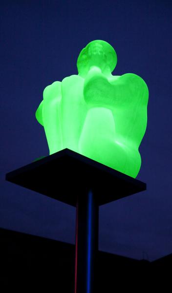 With Jaume Plensa, another world-class artist is represented in “Blickachsen 9”. Works by Plensa are on display in The Squaire and by the main entrance to the IG-Farben building, where his towering three “Poets in Frankfurt” await the visitor to the Westend campus. The ‘poets’ sit, relaxed and with their knees pulled up, like stylites – each perched on a platform on top of an almost six-metre high steel pole. In their posture they mirror the “Body of Knowledge” sculpture in the campus grounds. Going beyond mere considerations of form, Plensa is primarily concerned with the spiritual dimension in his works: he describes the body as the receptacle for the spirit, and he brings in both text and lighting as sculptural material. Like the Three Monkeys, considered in Asia to be symbols of wisdom, the three “Poets in Frankfurt” close off respectively either eyes, ears or mouth, and the script on their heads calls up associations of “Day-Night”, “Heaven-Hell-Poetry” and “Religion”. The LED light emanating from their insides makes them shimmer in white during the day, but when it gets dark they are illuminated in all the colours of the rainbow, in a sustained address to the observer’s imagination.
